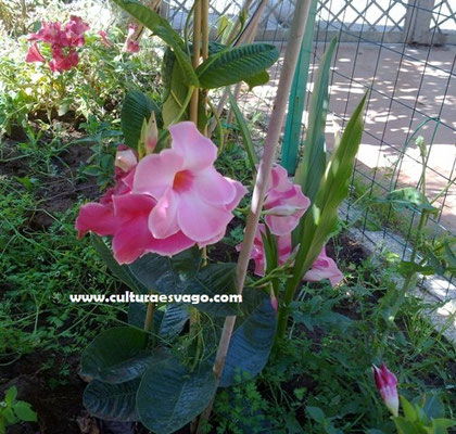 Dipladenia – Questo bel rampicante di origine tropicale deriva il suo nome dal greco diplos, doppio e aden, ghiandola, a causa della presenza di due ghiandole nell’ovario.